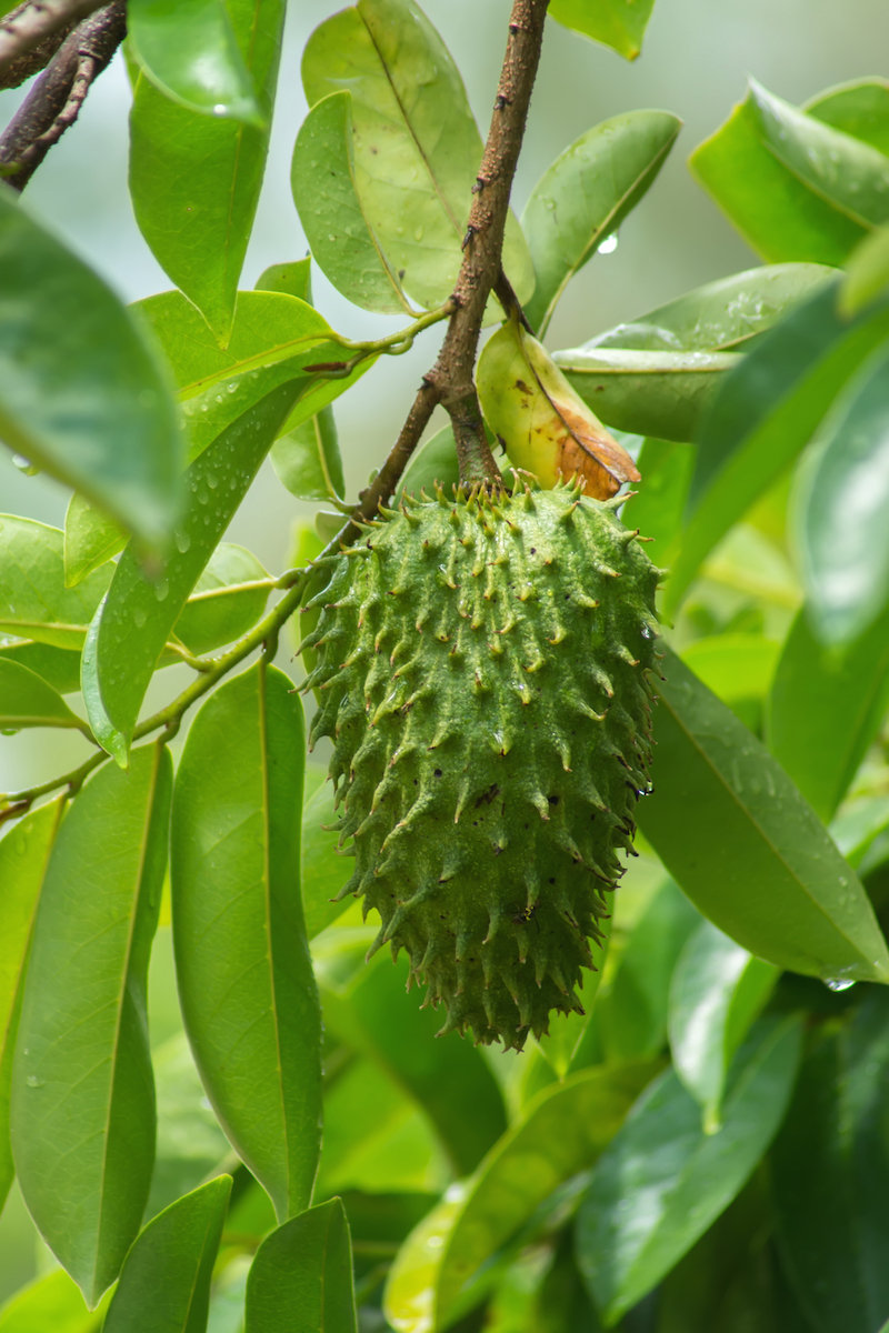 Guyabano trees (Anona muricata) produce green, pear-shaped fruit covered with soft spines. The fruit has many names: graviola, pawpaw, corossol, soursop, and custard apple. It is a popular staple in the Caribbean, Central America, Southeast Asia and South America. Guyabano leaves and seeds are edible. The mature fruit is used as a vegetable and can be cooked and eaten. When the fruit is very ripe it can be eaten raw, as a dessert, or used to make fruit nectar, smoothies, fruit drinks, candies, sorbets, and ice cream. The leaves can be boiled to make a tea or can be crushed and made into a poultice. Rewards come to those who wait because it takes Guyabano trees 3 to 5 years to start producing fruit!