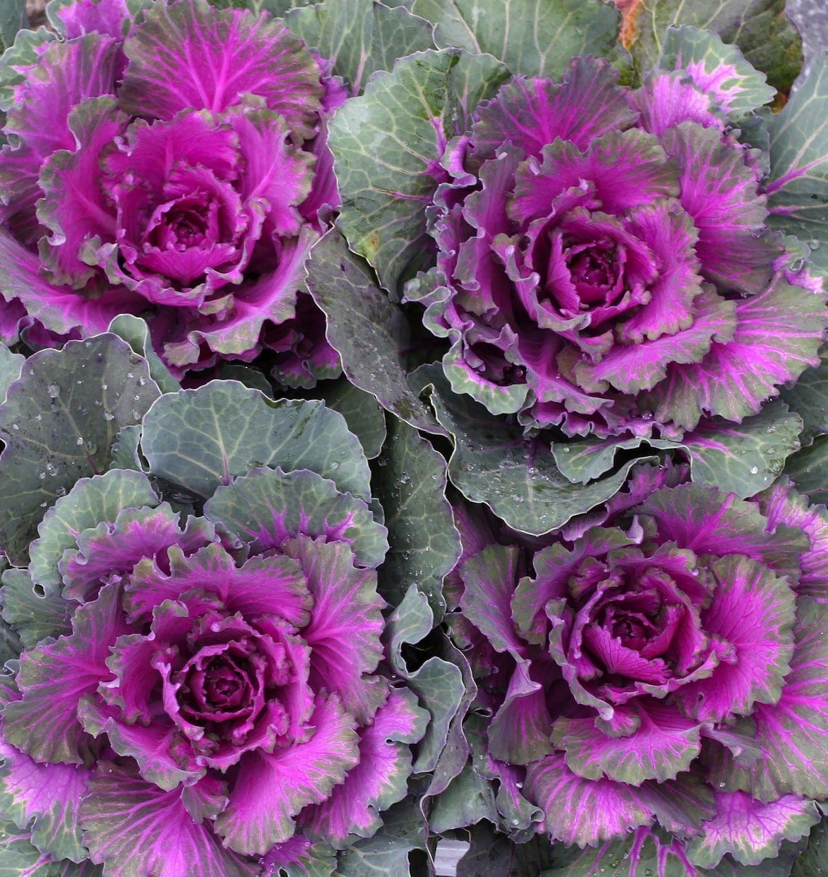 ornamental cabbageThese colorful cousins of conventional cabbage are outstanding in the fall and winter garden. The leaves are tinged white, red, purple, mauve, and rose. Color is enhanced by cool and frosty weather. Kale has looser head with frilly leaf edges. Cabbage is denser with well-rounded leaves. In the garden, combine them with pansy, nemesia and viola. In the home, the leafy, colorful rosettes can be cut and used in your holiday table arrangement. They are stunning with other cut seasonal foliage, twigs or branches, and gourds. As a bonus, they are edible and look grand as a garnish on a plate or serving dish.