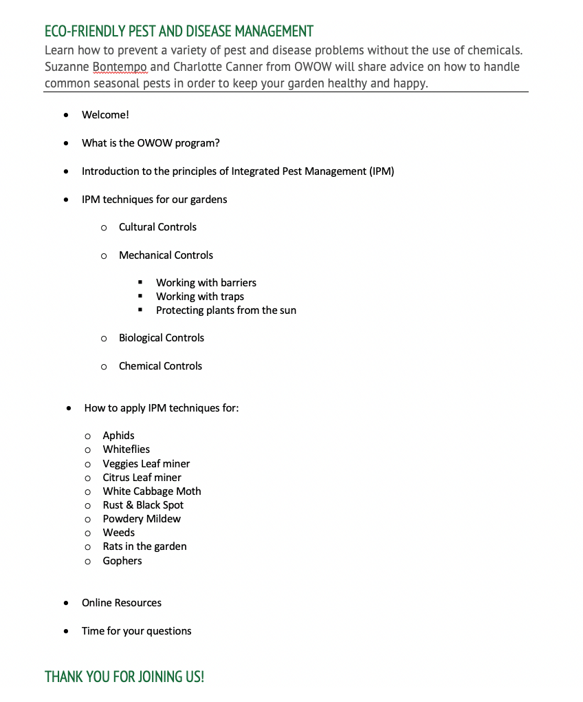 Learn how to prevent a variety of pest and disease problems without the use of chemicals. Suzanne Bontempo from OWOW shares advice on how to handle common seasonal pests in order to keep your garden healthy and happy. Scroll down for webinar supply list and resources!